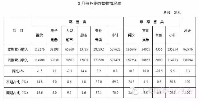 本月销售延续上月的增长态势,同、环比都有小幅增长。经我会和市商业信息中心对各商场上报的购物中心企业经营统计表汇总,8月份营业总规模为76.30亿元,按去年同期同口径73.83亿元,同比增长3.3%,比去年同比增幅减少了7.7个百分比,剔除新增3家企业因素,同比增长1.0%;按上期同口径72.63亿元,环比增长5.0%。
