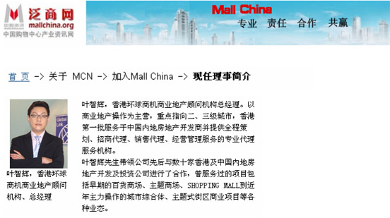 近日,环球商机总经理叶智辉先生获选为中国购物中心产业资讯中心·中购联发展委员会专家委员,为中国房地产开发商提供策划、招商、销售及资源整合等专业咨询服务。
