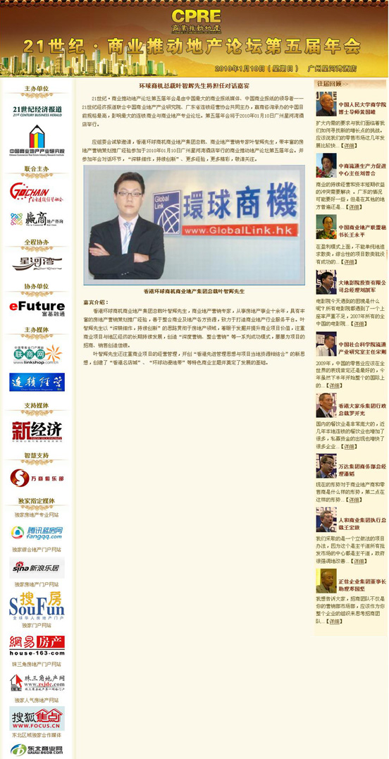 应组委会诚挚邀请,香港环球商机商业地产集团总裁、商业地产营销专家叶智辉先生,带丰富的房地产营销策划推广经验参加于2010年01月10日广州星河湾酒店举行的商业推动地产论坛第五届年会。并参加年会对话环节,“深耕细作,持续创新”、更多经验,更多精彩,敬请关注。