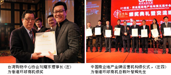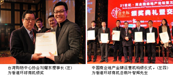 2010年1月10日,由21世纪经济报道联合中国商业地产产业研究院、广东省连锁经营协会、赢商(中国)商业地产服务机构共同主办的21世纪·商业推动地产论坛第五届年会如期拉开帷幕,大会主题除了对2009年全年的商业地产发展现状作一回顾总结外,同时也邀请到了各界商业领袖对未来国内商业格局进行精彩演讲、高端对话及经验分享,展望行业发展趋势,分享城市综合体开发要诀与创新模式。当天晚上也隆重举办了颁奖典礼,包括“中国商业地产领袖人物”、“中国商业地产金牌操盘手”、“中国商业零售业卓越企业”、“中国商业地产领袖企业”等奖项,香港环球商机集团凭借丰富的商业地产操作经验、新颖的商业营销思维模式及出色的全球资源整合能力,最终荣获大会颁发“中国商业地产金牌运营机构”之奖项,香港环球商机商业地产集团总裁叶智辉先生代表领取了该奖项。