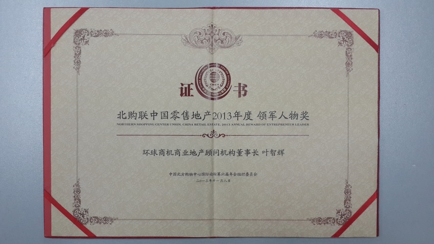 2013年11月8日香港环球商机CEO叶智辉先生在中国北方购物中心国际论坛第六届年会暨2013 中国零售地产博览会荣获“北购联中国零售地产2013年度领军人物奖”之荣誉。叶智辉先生已从事商业地产服务十数年,十多年来他不断创新、与时共进、屡获佳绩,具备丰富的商业地产操盘经验,曾服务过国内无数个商业地产项目,受到广大业界同行的认可与好评。近年来,叶智辉先生整合商业及地产各方资源,把握商业地产发展趋势,带领公司先后与数十家香港及中国内地房地产开发及投资公司进行合作,为开发商提供全程策划、招商代理、销售代理、经营管理等一站式专业服务。