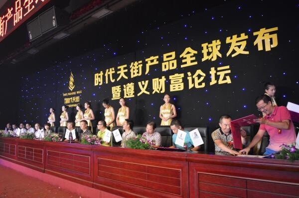 论坛结束后,“遵义·时代天街”项目产品举行了隆重的全球发布和现场品牌招商签约仪式;现场签约的品牌包括德克士、禾绿回转寿丝、张玉珊修身堂、研磨时光咖啡、拉夏贝尔、天梭表、梅花表、依波路表、味千拉面、百丽集团等十大国内外大知名品牌。