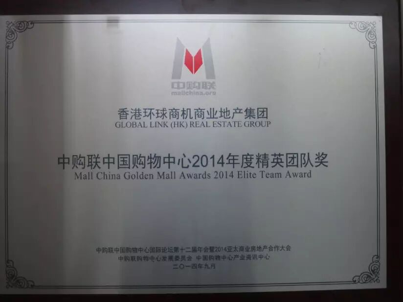(香港环球商机荣膺中购联中国购物中心2014年度精英团队大奖)